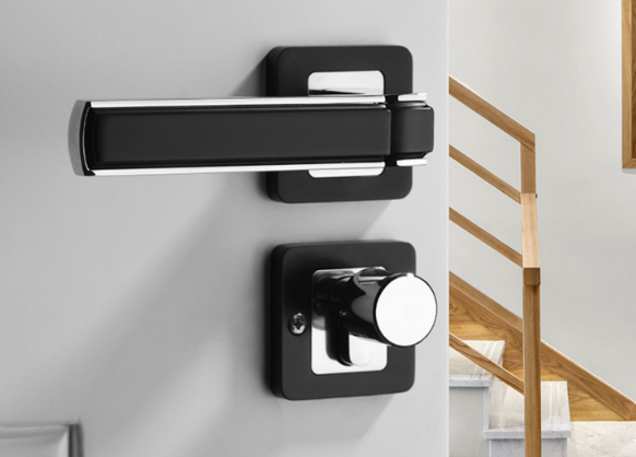 5、按照步驟3方法將鎖芯防盜殼安裝好后在安裝把手,安裝把手前,現(xiàn)將保險(xiǎn)栓插入,再安裝上面的把手。
